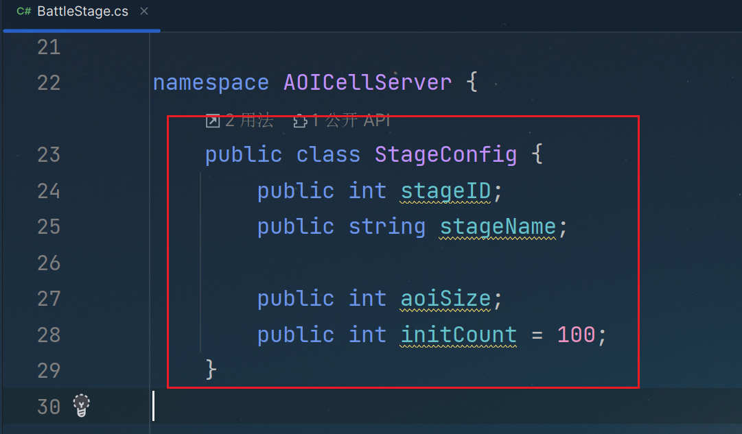 回到地图方块相关,还声明了几个AOICell数组,分别代表,八个方向的方块位置数组,还有一个IsCalcBoundary的布尔,是用来判断,是否可以进行,地图方块的逻辑处理运算; clientEntityConcernCount 和 serverEntityConcernCount 两个int数据,分别代表,游戏内,创建出来的玩家Entity实体,是客户端创建,还是服务器创建的,总数目; 还有三个哈希HashSet容器,是用来,处理视野变化和融合的方块变动,逻辑相关,是在该方块上的实体变动:holdSet是待在该方块上、enterSet是刚进入该方块、exitSet是离开该方块,这三个汇总实体的,数据容器; 更新item的cellUpdateItem变量,是配合Entity实体的变化,发送对应的网络数据包,和修改容器数据; 在构造函数,完成各个变量的初始化即可;