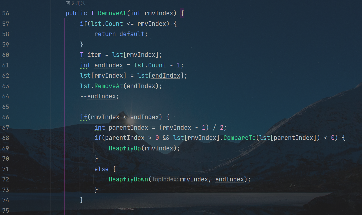 这俩接口,HeapfiyUp是通过CompareTo把比较最大值放到堆顶端; HeapfiyDown是在topIndex索引,和endIndex索引之间,重新排序,把比较最小值,放到堆底端; 因为会有,在堆里移除某个索引数据的Remove逻辑,所以移除之后,也需要HeapfiyDown,对剩余的堆进行重新排序;