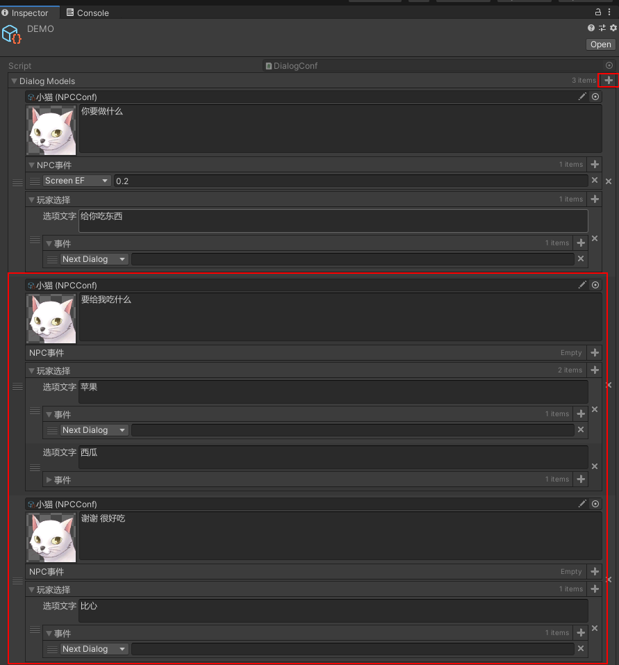 先弄好第一个对话 其中是小猫npc,提问,然后屏幕闪烁0.2秒 玩家选择只有一个“给你吃东西”,然后玩家事件是下一个文本