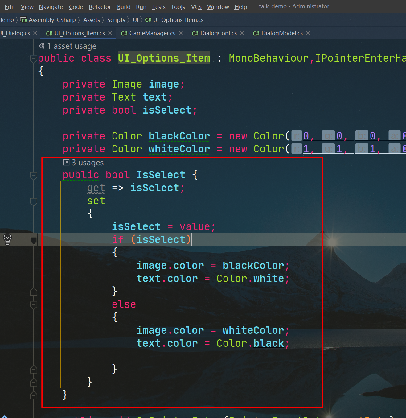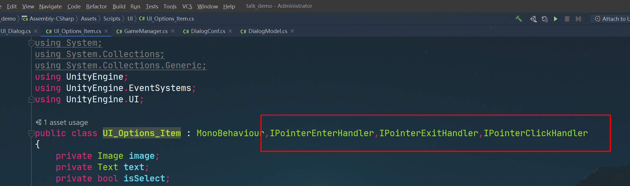简单介绍一下,选项类的代码实现,因为是涉及到按钮点击,所以除了mono之外,还继承了这些