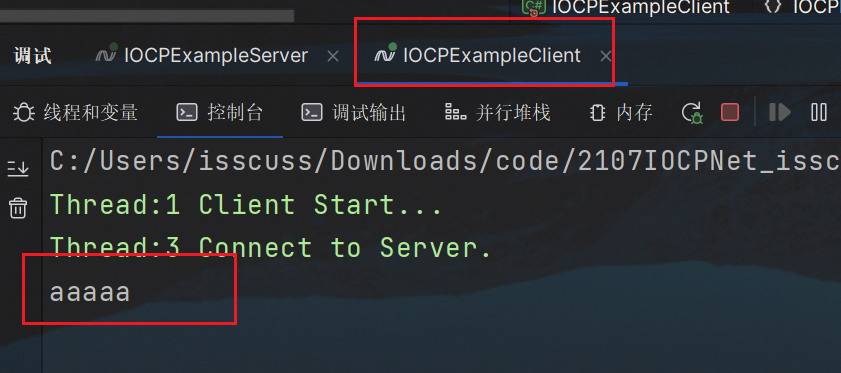 这是服务器实例的,具体逻辑,设定IOCPToken连接的,最大缓存池数目是10000,在while死循环中,进行ReadLine输入监听,如果输入“quit”字符,回车,就会CloseServer关闭服务器; 如果输入,其他字符,就是遍历所有,连接的客户端Token,发送broadcast前缀的相关消息,也就是广播的逻辑实现;