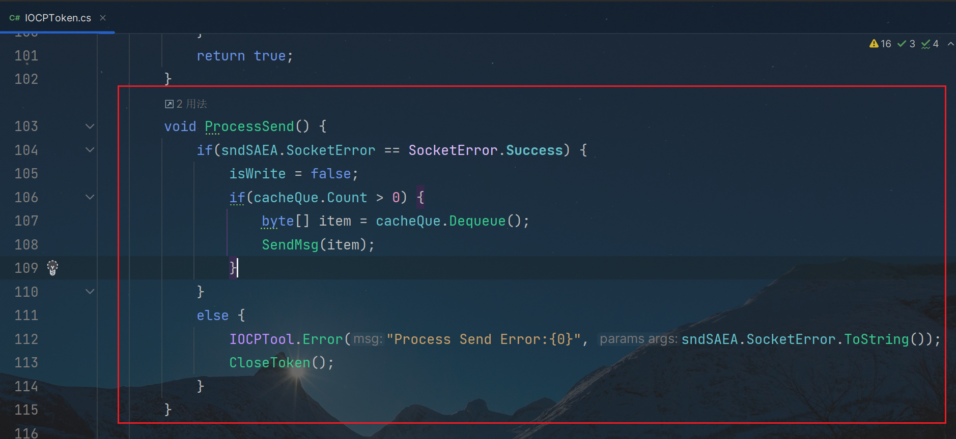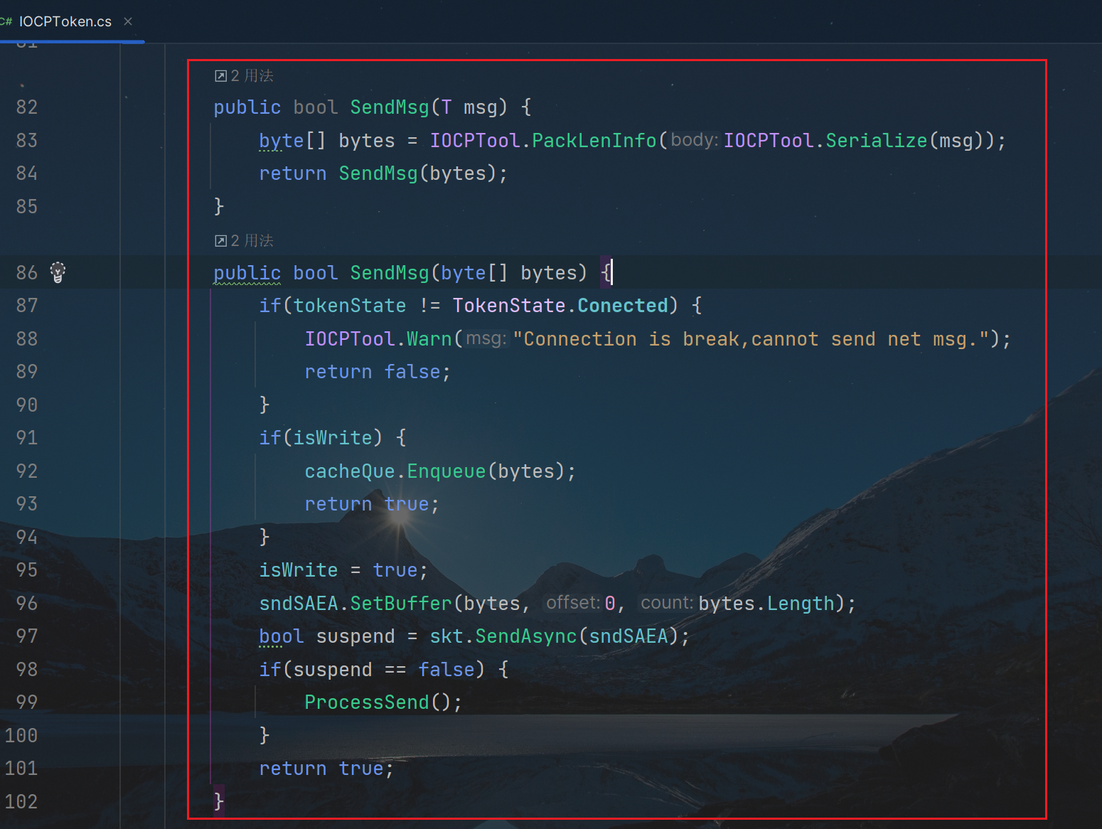 连接体IOCPToken里,还有俩SendMsg的函数; 其中第一个,把msg的网络包,通过IOCPTool工具类的Serialize函数接口,完成序列化,和PackLenInfo函数接口,打包tcp网络消息包,变成字节数组bytes,再传参到,重载的,第二个SendMsg函数接口中; 第二个SendMsg函数接口,是通过isWrite这个布尔判断,是否要把发送的,字节数组消息,写入到cacheQue队列容器中; 然后,使用Socket.SendAsync的异步发送接口,判断SocketAsyncEventArgs类的异步发送套接字sndSAEA状态,如果为false,就调用ProcessSend函数接口,完成消息发送即可;