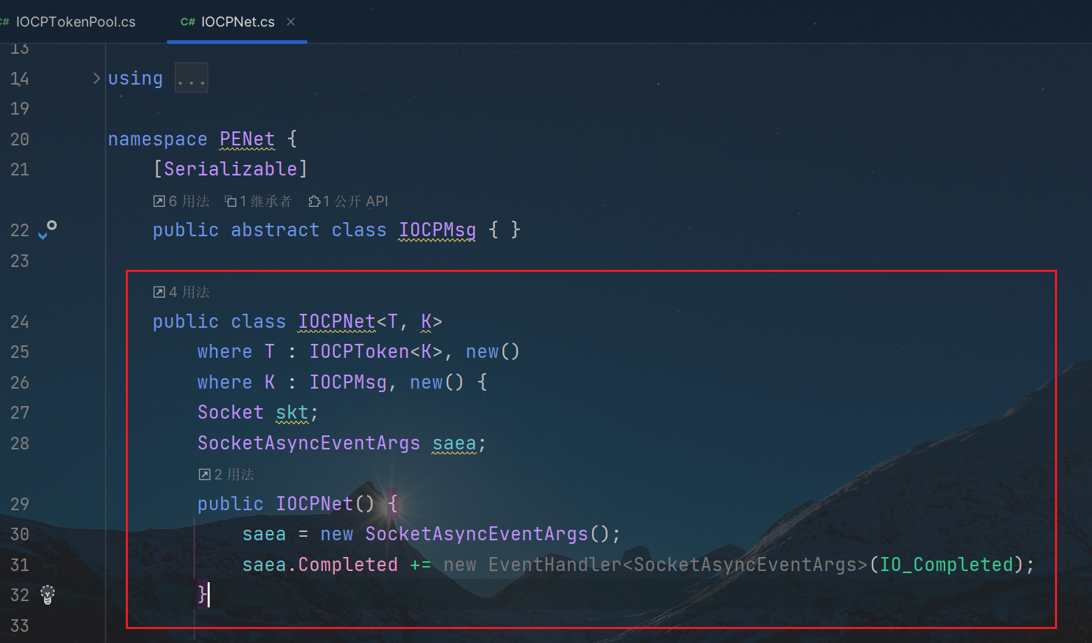 IOCPNet是网络库的,核心逻辑整合,会调用之前解析的,其他逻辑模块; 声明一个Socket连接套接字skt、还有一个异步网络连接SocketAsyncEventArgs变量saea; 在构造函数中,完成saea的初始化,和完成回调绑定;