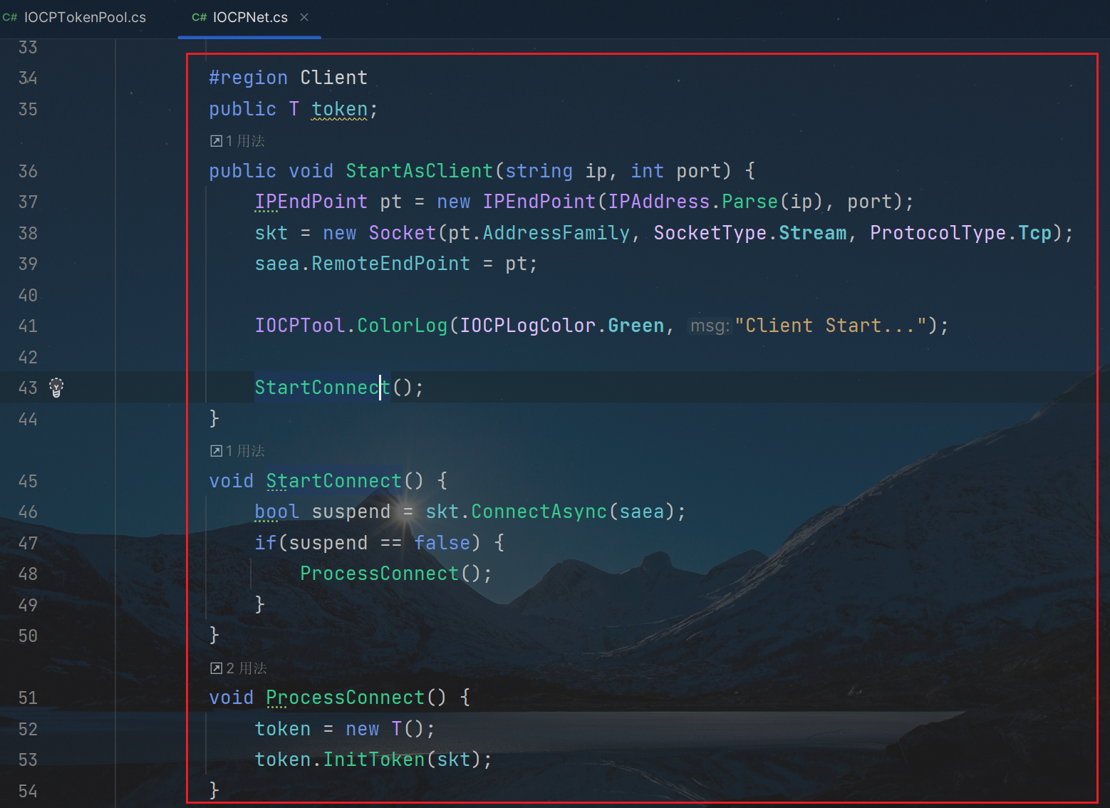 先解析Client客户端的具体逻辑; StartAsClient函数接口,就是外部调用的,开启一个tcp的客户端的逻辑,传参包括ip地址和port端口,完成socket网络套接字的初始化、构建,然后调用StartConnect函数接口,开始构建异步连接; 使用的是Socket.ConnectAsync对远程主机,异步连接请求,返回值suspend为false的时候,说明连接成功建立,调用ProcessConnect函数接口,开始初始化,客户端的Token连接,调用对应的InitToken函数接口即可;