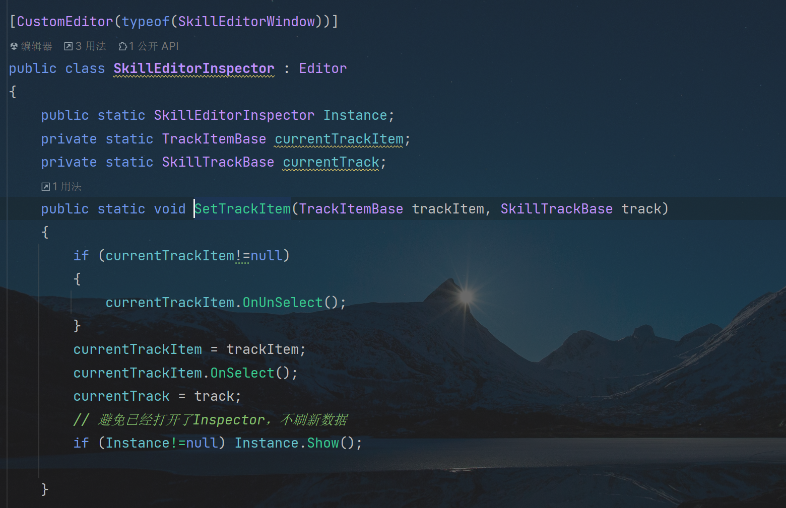 设置,选择当前轨道; 这个是技能编辑器本身的,CustomEditor属性面板逻辑; 调用当前轨道的OnSelect选中函数