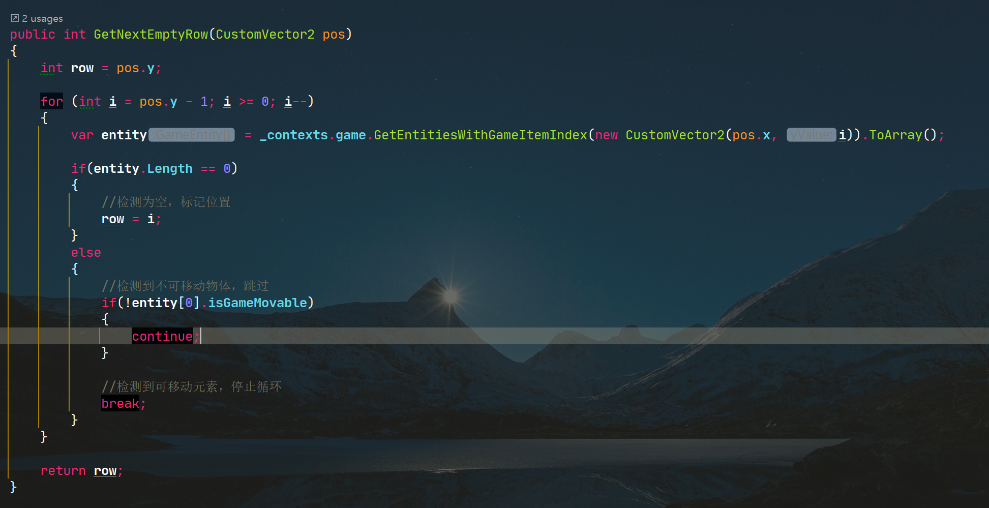这里,就是判空逻辑 还是通过坐标索引,看是否能拿到实体,如果拿不到,长度为0,就说明为空 还有可能遇到,是不可移动物体,例如创建出来的障碍物,就直接continue就好