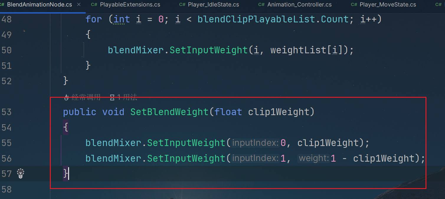 然后,就到了移动的状态节点了; 移动状态用到了,混合动画节点:走路和跑步,走路的index是0,跑步是1; 这里是核心的修改两者权重的逻辑