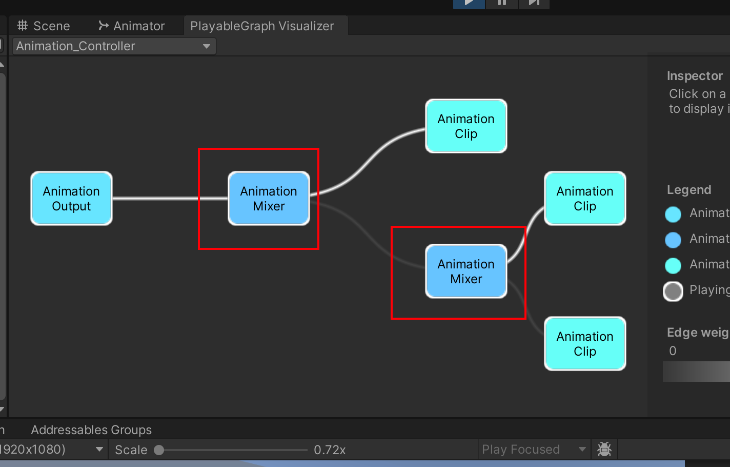 第二个mixer混合器,是开始步行的时候,才新增的; 有步行和跑步,俩动画,inputcount是2; 然后链接俩mixer混合器