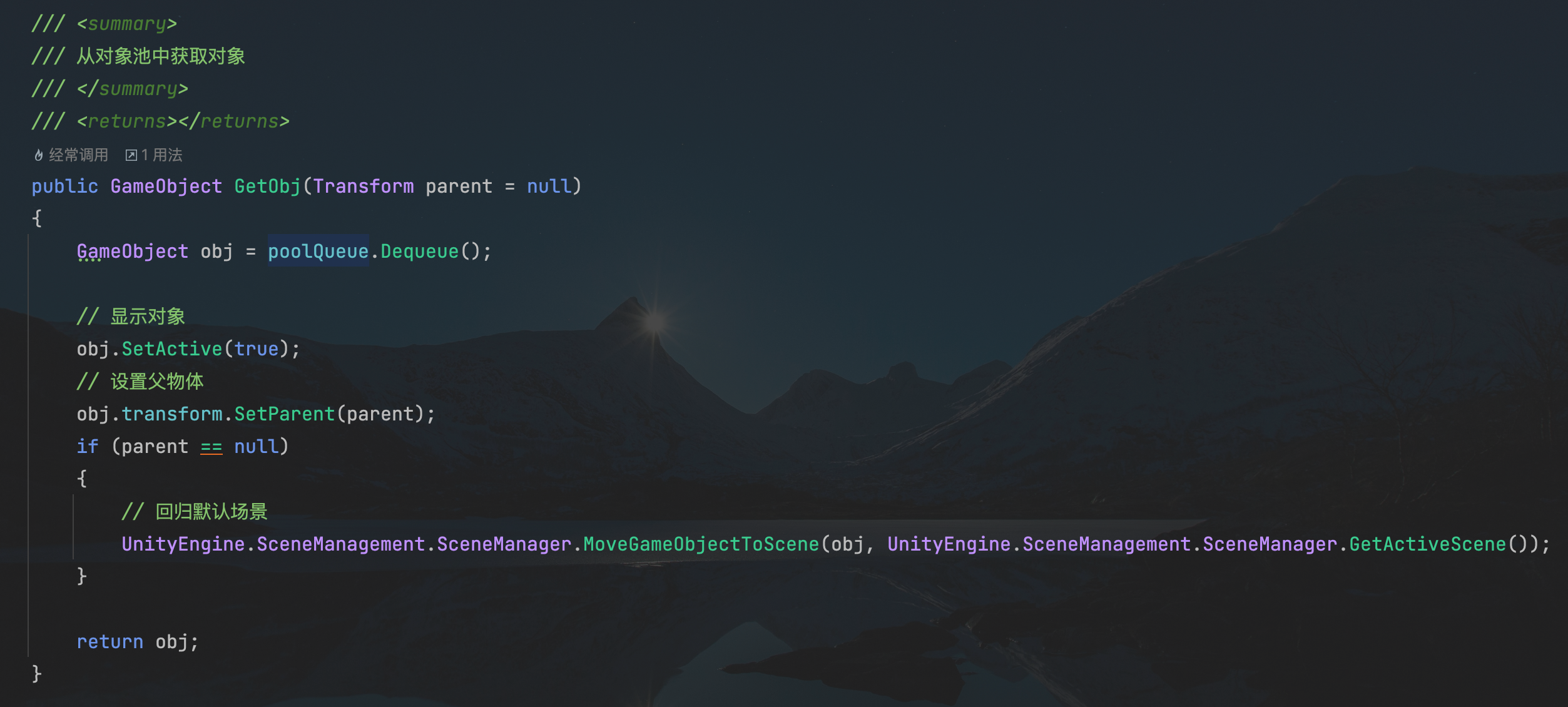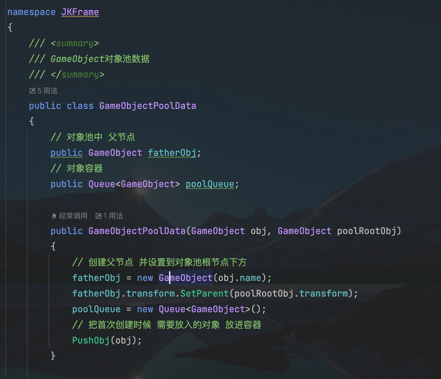 其中,游戏实体类,构造函数,逻辑上,就是创建一个新的游戏实体,然后,放到对应的父物体即可; 还会整一个poolQueue队列容器,存放对象