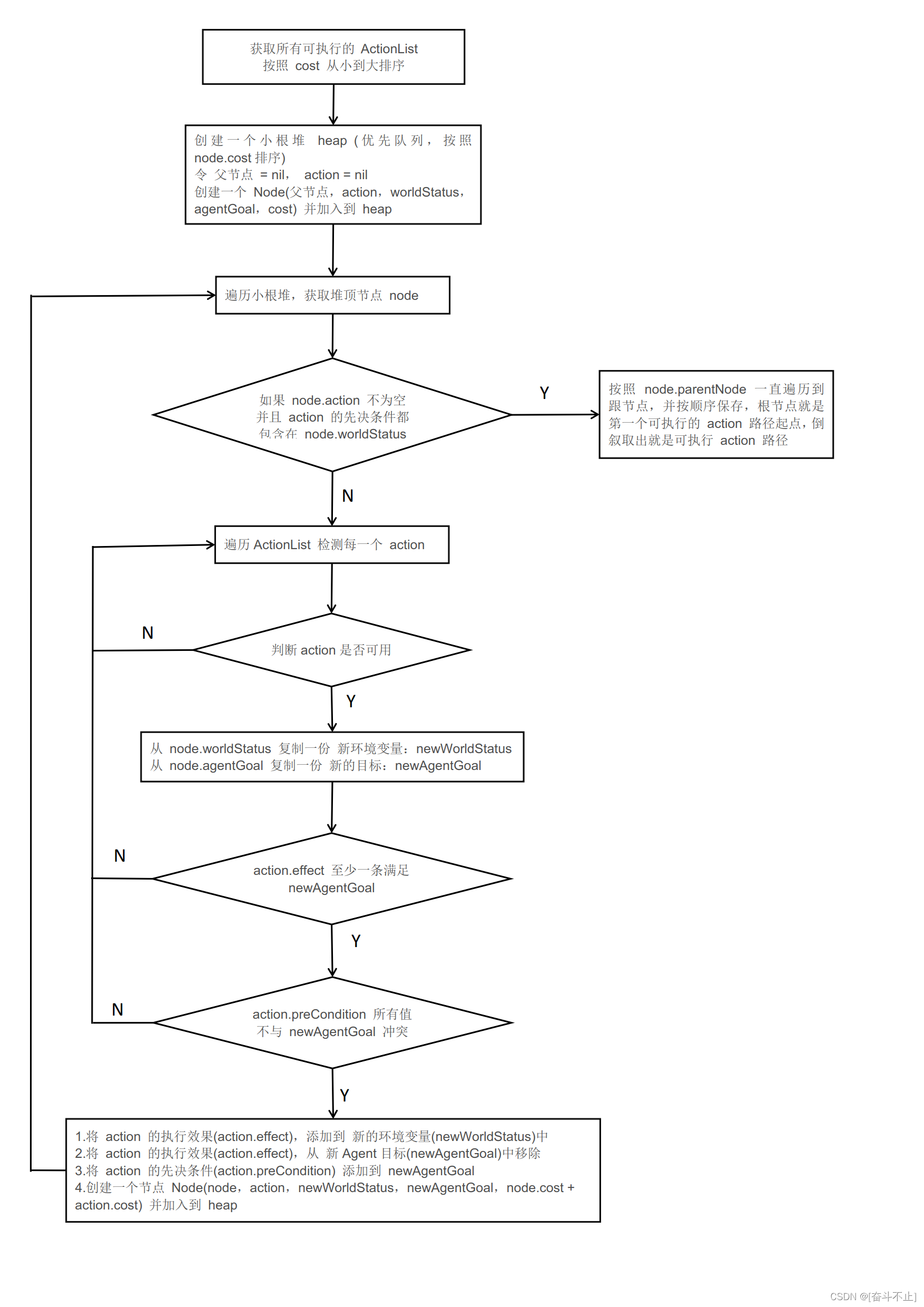 4.Planer: 决策者, 通过各个类来决策出最优的路线供Agent使用, 执行逻辑:大体思路是依据 AStar 寻路算法的思想,从目标开始往前查找 Action,如果Action 的效果能够完成至少一个目标,则将 Action 的效果写入到环境变量,然后将 Action 的前置条件写入到目标,继续往前查找