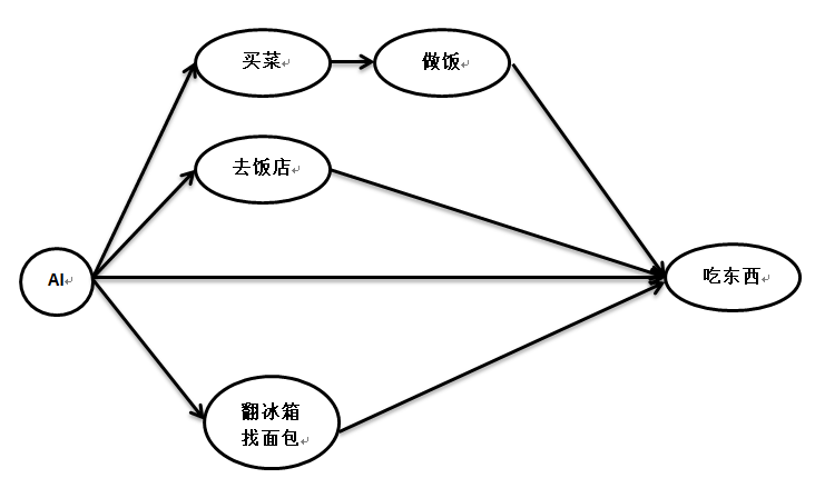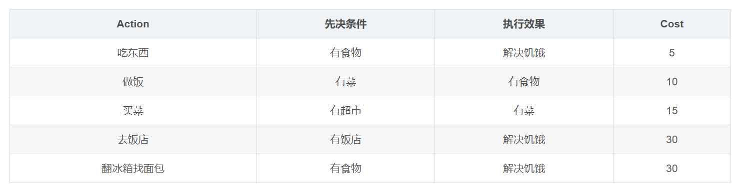 2.Action:动作: 可以被执行的动作,比如:拿东西、丢东西、吃饭、伐木等, 每个 Action 有需要有:执行的先决条件 preCondition,执行后的效果 effect 每个 Action 的执行需要设定一个代价:Cost 如 吃饭行为 执行的先决条件:饿了、 有食物 执行后的效果: 解决饥饿 如 伐木行为 执行的先决条件:有树木、有斧头 执行后的效果:获得木头