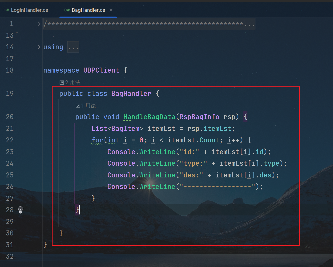 客户端对应的,Main主函数,调用对应,逻辑根节点的Init初始化,然后while死循环中,ReadLine监听输入,如果输入"login"就会发送,客户端登录请求; 如果输入"bag"就会发送,提取背包数据请求;