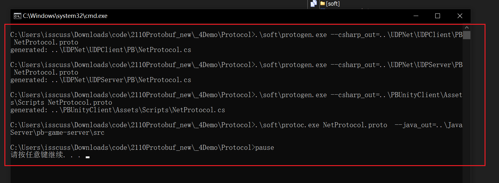 批处理脚本逻辑,会调用soft目录的protogen.exe可执行程序,将NetProtocol.proto协议文件,解析成脚本逻辑文件; C#相关的,输出路径是,回到上层目录,然后再前往,仨文件夹,分别对应:UDP客户端、UDP服务端、unity客户端的Asset目录对应的文件夹; 还有一个是java相关的,会输出到,java服务器的相关路径;