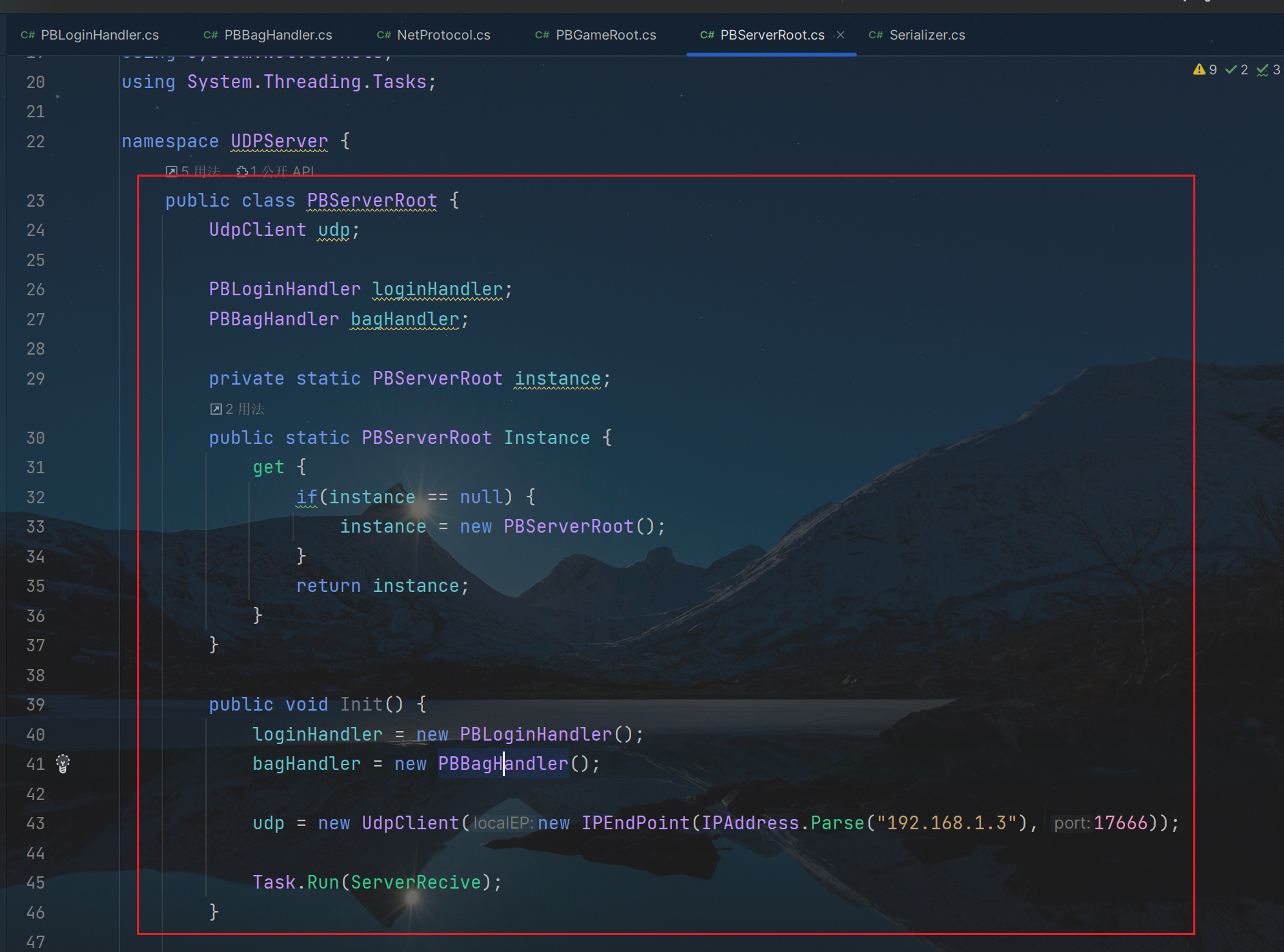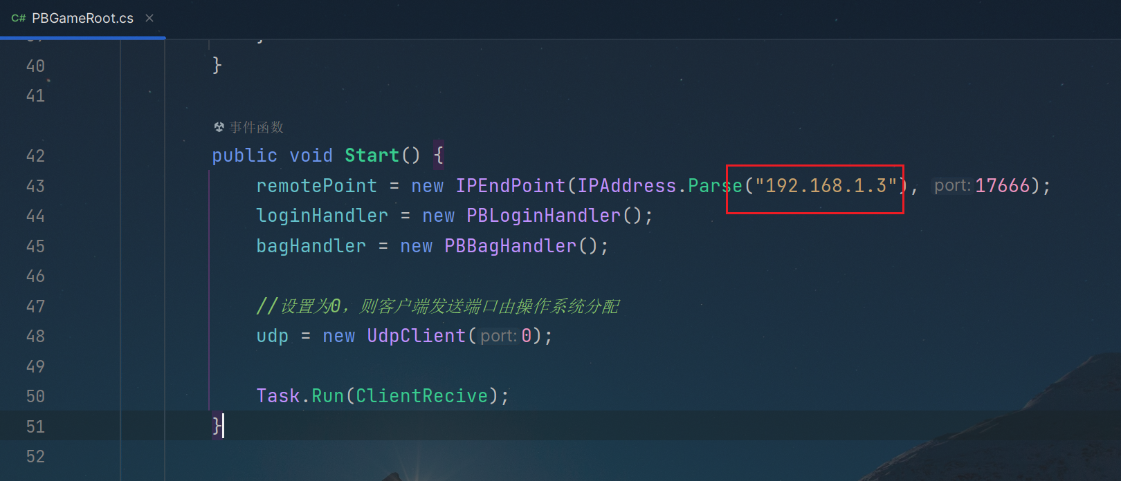 客户端的,逻辑根节点,也是声明一个udp客户端、登录和背包的Handler回包处理逻辑,对应服务器ip、单例instance和获取器