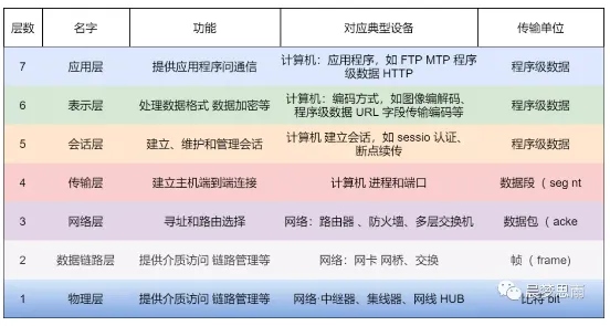 这个 ISO 层网络模型各层的名字、主要功能对应的典型设备和传输单位如下图: