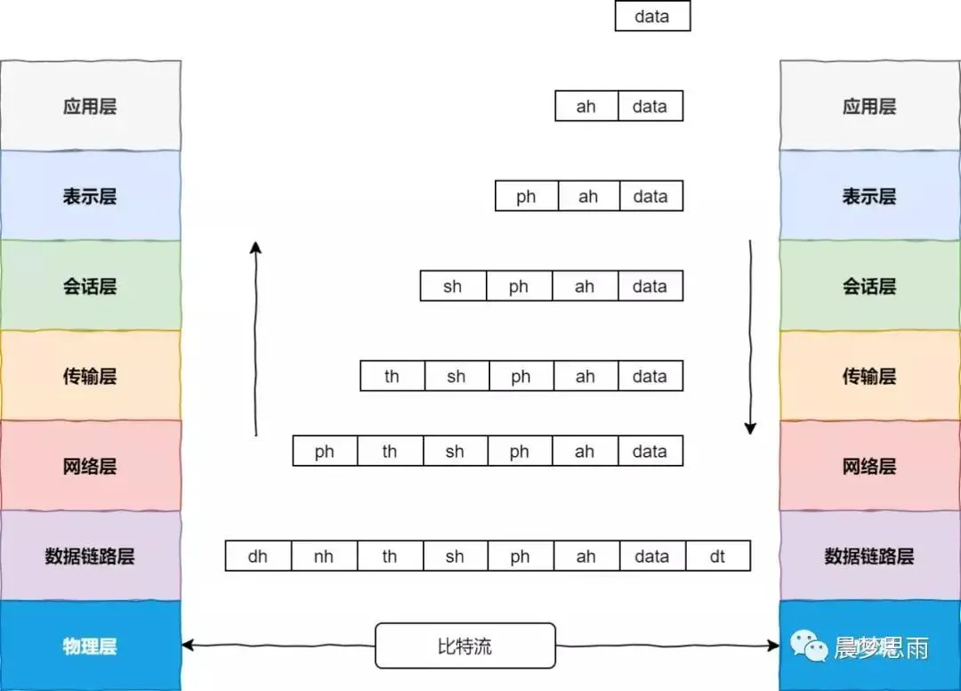 同样,会话层、传输层、网络层(假设用 TCP 传输,则是 TCP 数据+ IP 包头)、数据链路层(把上层的 TCP 数据+ IP 头统一称为帧数据,即帧 +帧数据+帧尾(CRC)也都要分别给上层递交下来的数据加上自己的报头)。