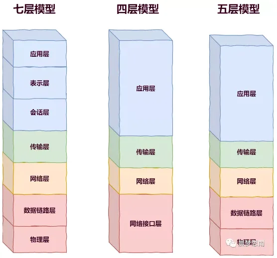 前面的两种模型都是学术上的概念,使用并不广泛 还有一个四层模型,使用最为广泛一 TCP/IP 分层模型。几种模型如下图: