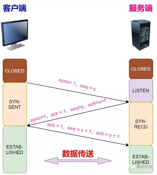 对于建连接的三次握手,主要是要初始化 Sequence Number 的初始值。通信的双方要互相通知对方自己的初始化的 Sequence Numbe,所以叫 SYN 。