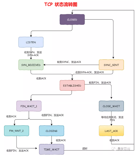CLOSED状态:当收到 ACK 报文后,也即可以进入到 CLOSED 可用状态了。