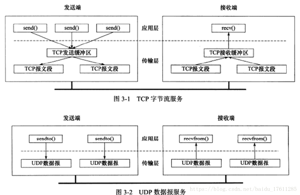 以下就是TCP字节流服务和UDP数据报服务的具体框图:(TCP多对多,UDP一对一)