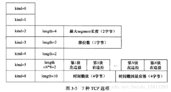 选项的第一个字段kind说明选项的类型。有的TCP选项没有后面两个字段,仅包含1字节的kind字段。第二个字段length(如果有的的话)指定该选项的总长度,该长度包括kind字段和length字段占据的2字节。第三个字段info(如果有的话)是选项的具体信息。常见的TCP选项有7中,如下图