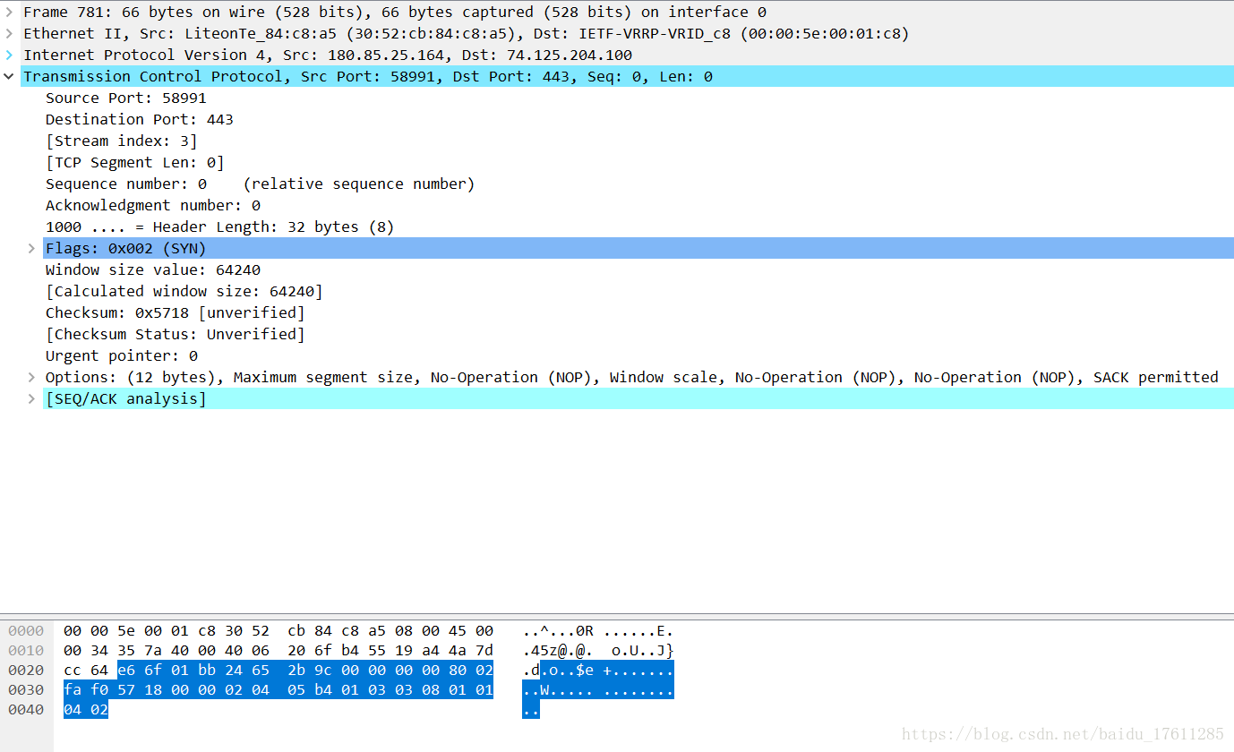 从图中可以看出源端口号58991对应e66f,目的端口号443,对应01bb,Flags为SYN,表示请求一个连接,因此它是一个同步报文段。这里seq表示的是相对序号,因为该同步报文段是从180.85.25.164到74.125.204.100的第一个TCP报文段,所以该序号值也就是此次通信过程中该传输方向的ISN值,则相对序号即为0。并且,因为这是通信过程中第一个TCP报文段,所以它没有针对对方发送来的TCP报文段的确认值(尚未收到任何对方发来的TCP报文段)。