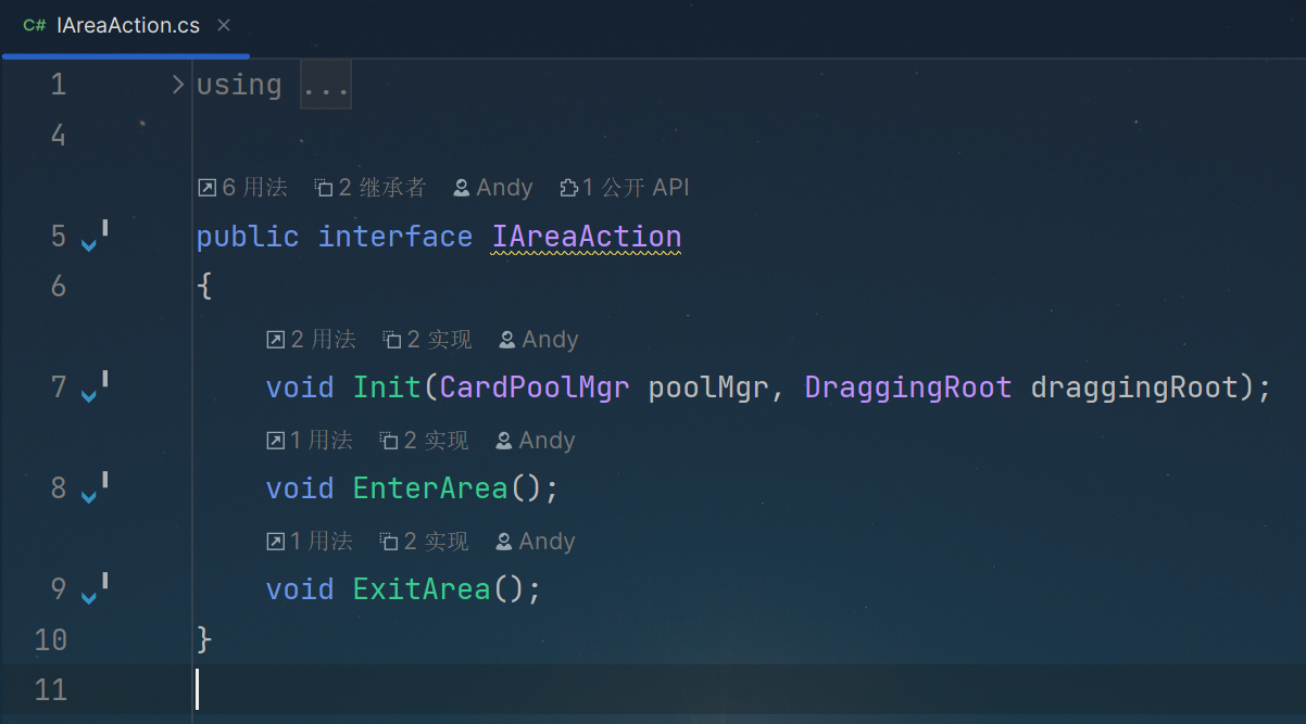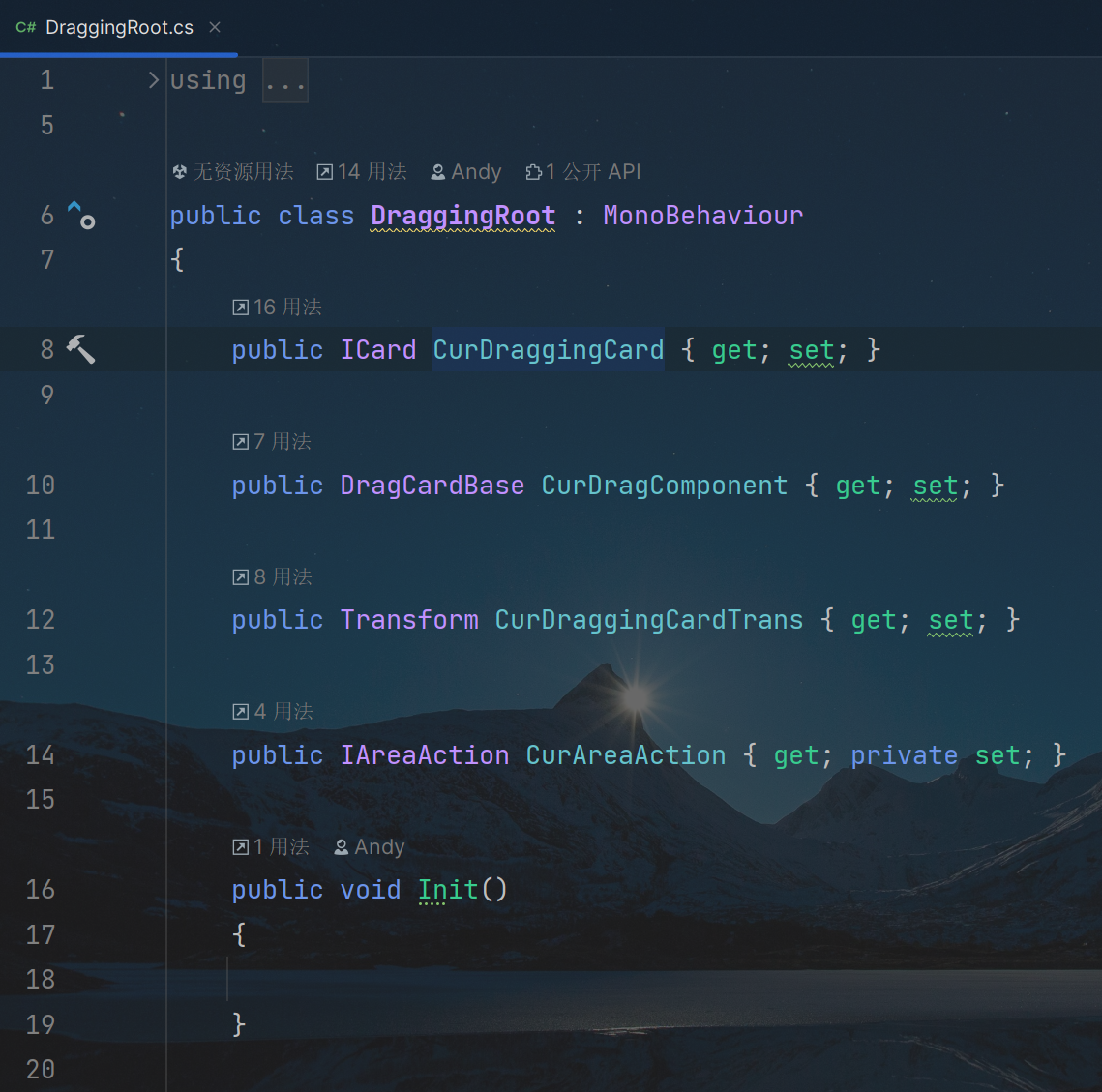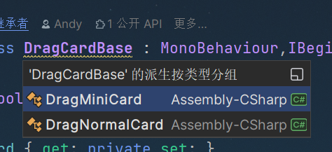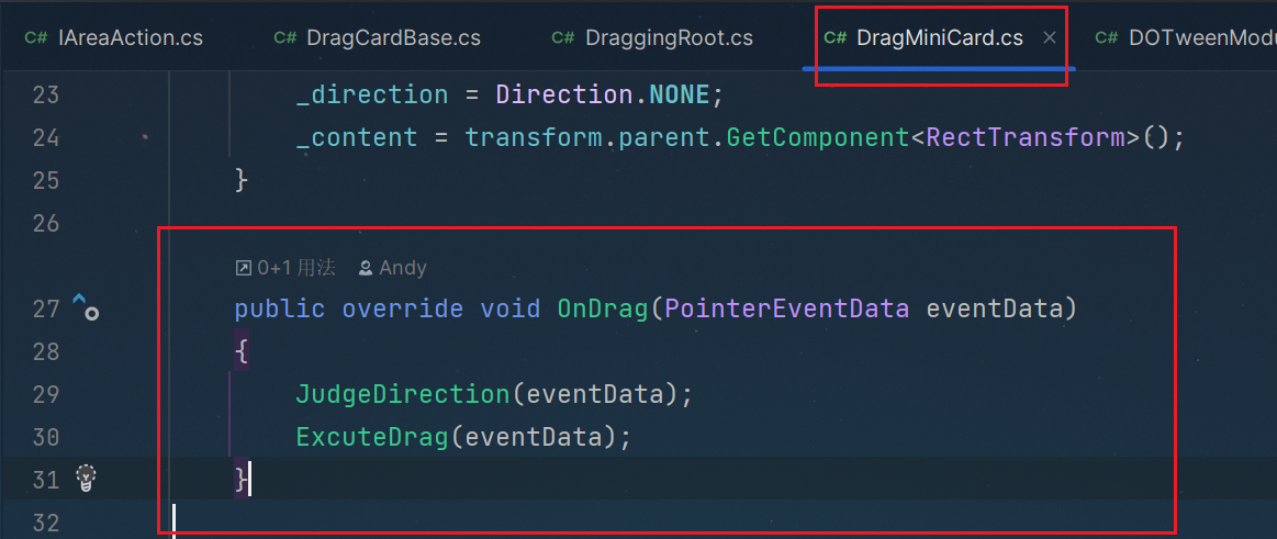 这是拖曳的根节点,声明的变量中,除了卡牌基类,当前拖曳卡牌实体CurDraggingCardTrans 和 当前拖曳区域 CurAreaAction ,还有一个卡牌实体 拖曳逻辑的,基类 CurDragComponent