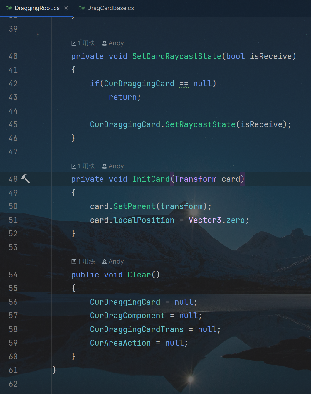 各个函数,调用ICard基类的,设置射线检测开关,初始化卡牌的逻辑,是设置父物体,还有重置局部坐标; Clear就是简单的设null清空了; 在拖曳过程中,实例化出来的拖曳卡牌,会以根节点作为父节点,跟随一起移动;