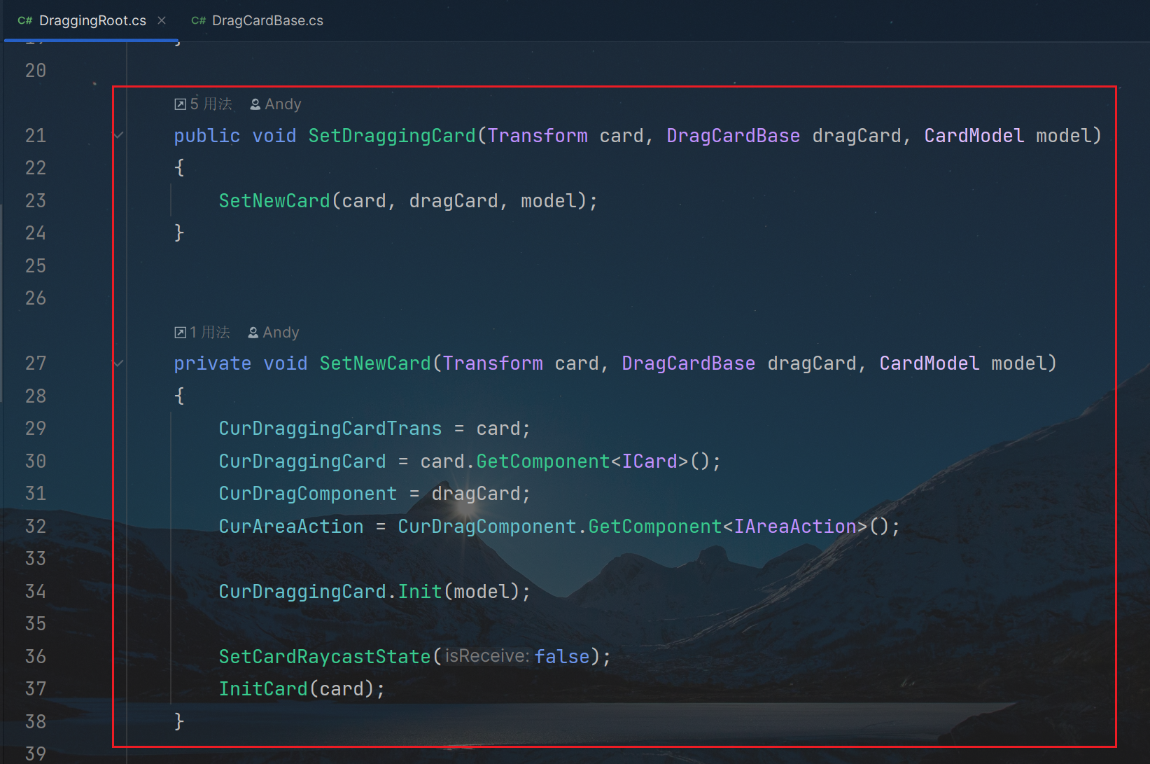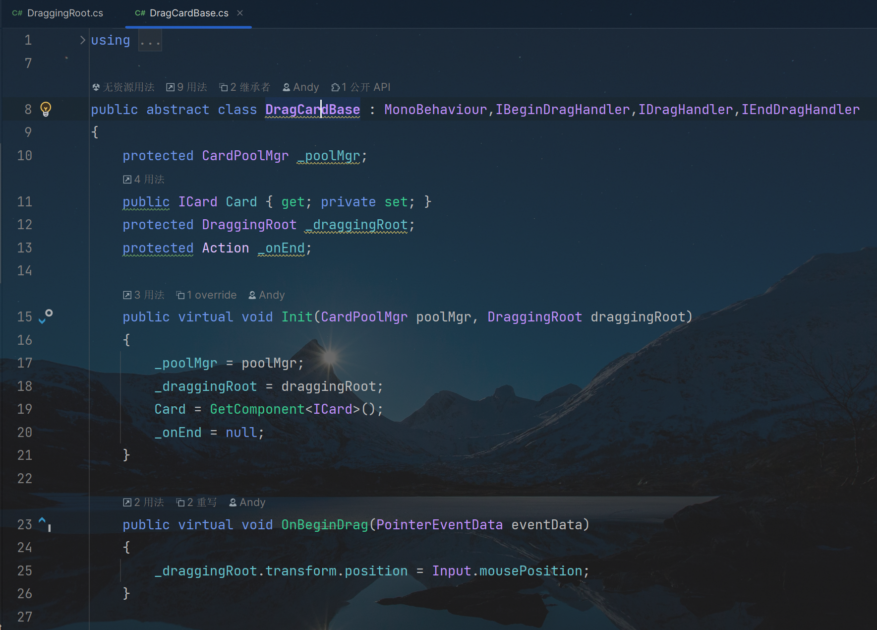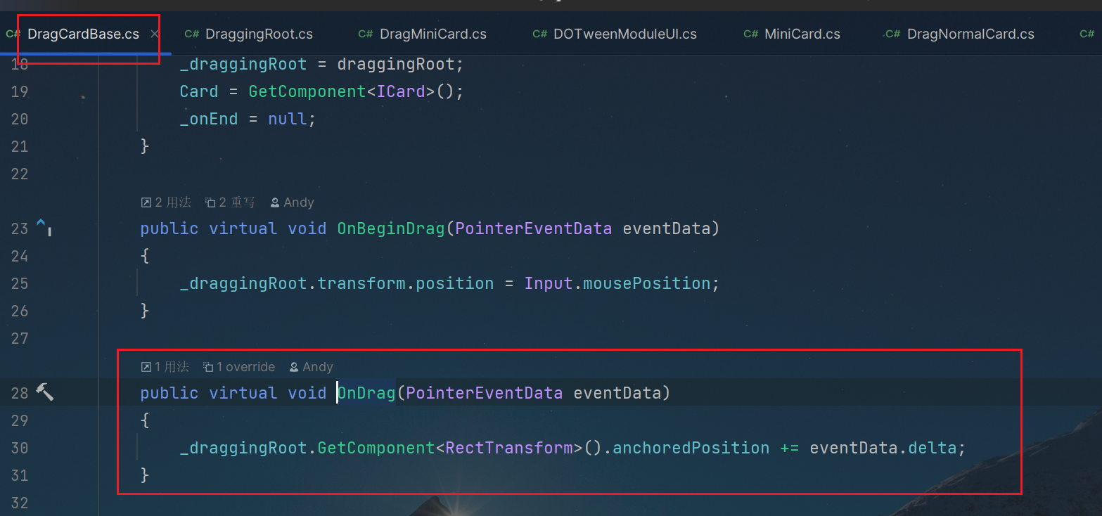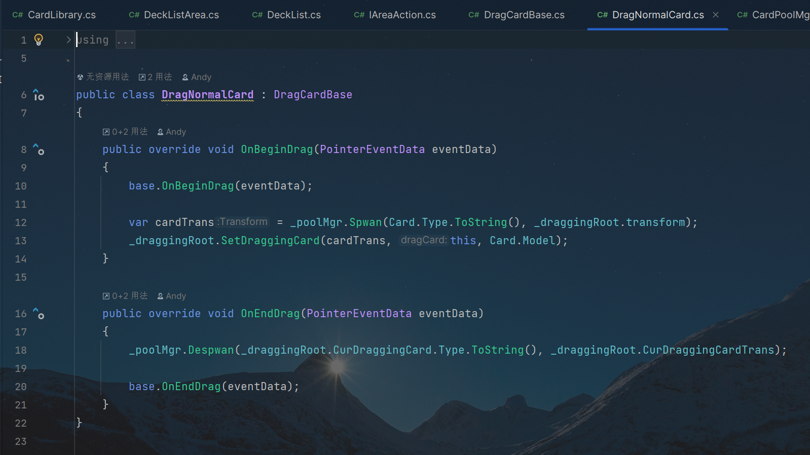 卡牌实体,拖曳的相关逻辑基类,声明对象池管理类 CardPoolMgr,和 ICard 卡牌基类接口,DraggingRoot拖曳的根节点,还有_onEnd是结束拖曳的Action事件回调; 其中开始拖曳的相关逻辑OnBeginDrag,就是把 拖曳根节点 DraggingRoot 的绝对位置,使用鼠标位置 Input.mousePosition 赋值即可;