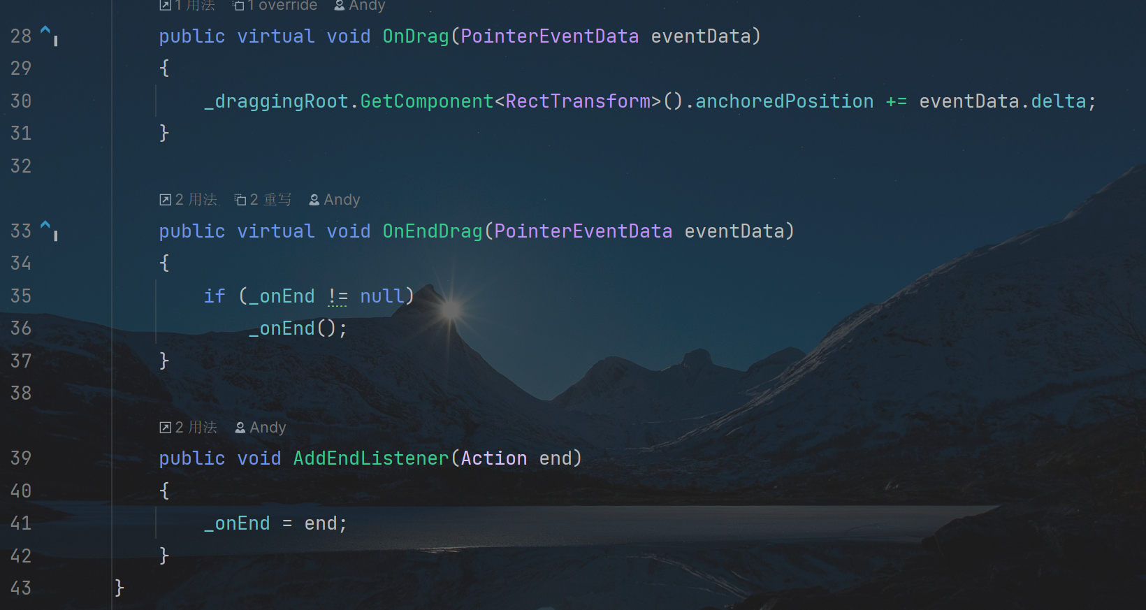 剩余的函数体,分别是拖曳过程中,实时修改拖曳根节点的锚点坐标; 结束拖曳的时候,调用OnEndDrag即可; 还有AddEndListener函数,就是完成,拖曳结束函数_onEnd的回调赋值;