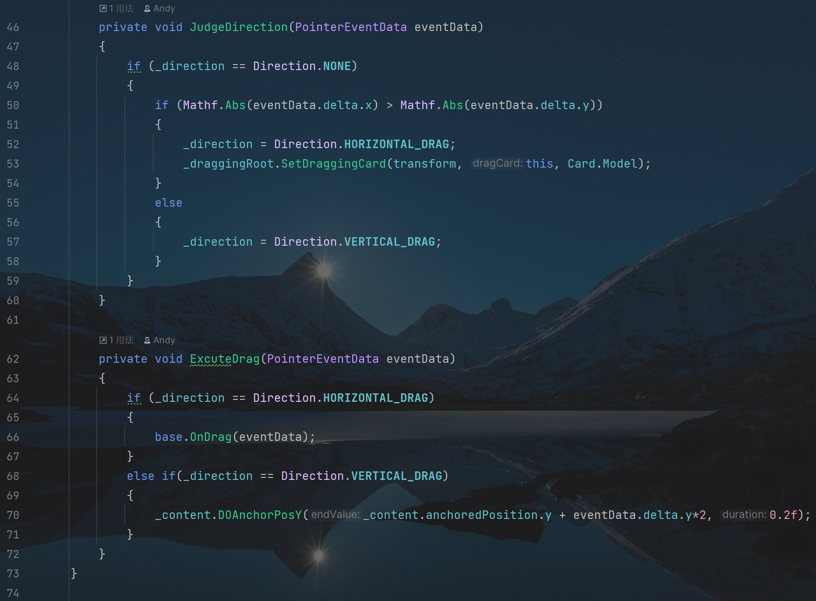 继续看,小卡拖曳逻辑的其他函数,JudgeDirection是根据 PointerEventData 的 delta的x和y比较,完成方向的赋值; ExcuteDrag函数的相关逻辑,就是根据不同的方向,调用不同的逻辑,其中水平方向移动,就会调用父类的OnDrag逻辑,如果是纵向移动,就调用父物体_content的Dotween动画插件的 DOAnchorPosY函数接口,纵向移动即可;