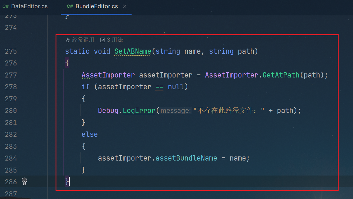 继续,把打包的汇总数据体AssetBundleConfig,分别写入xml和byte文件,其中byte文件,也会打成ab包,所以也调用一下,SetABName函数接口,完成标签设定即可