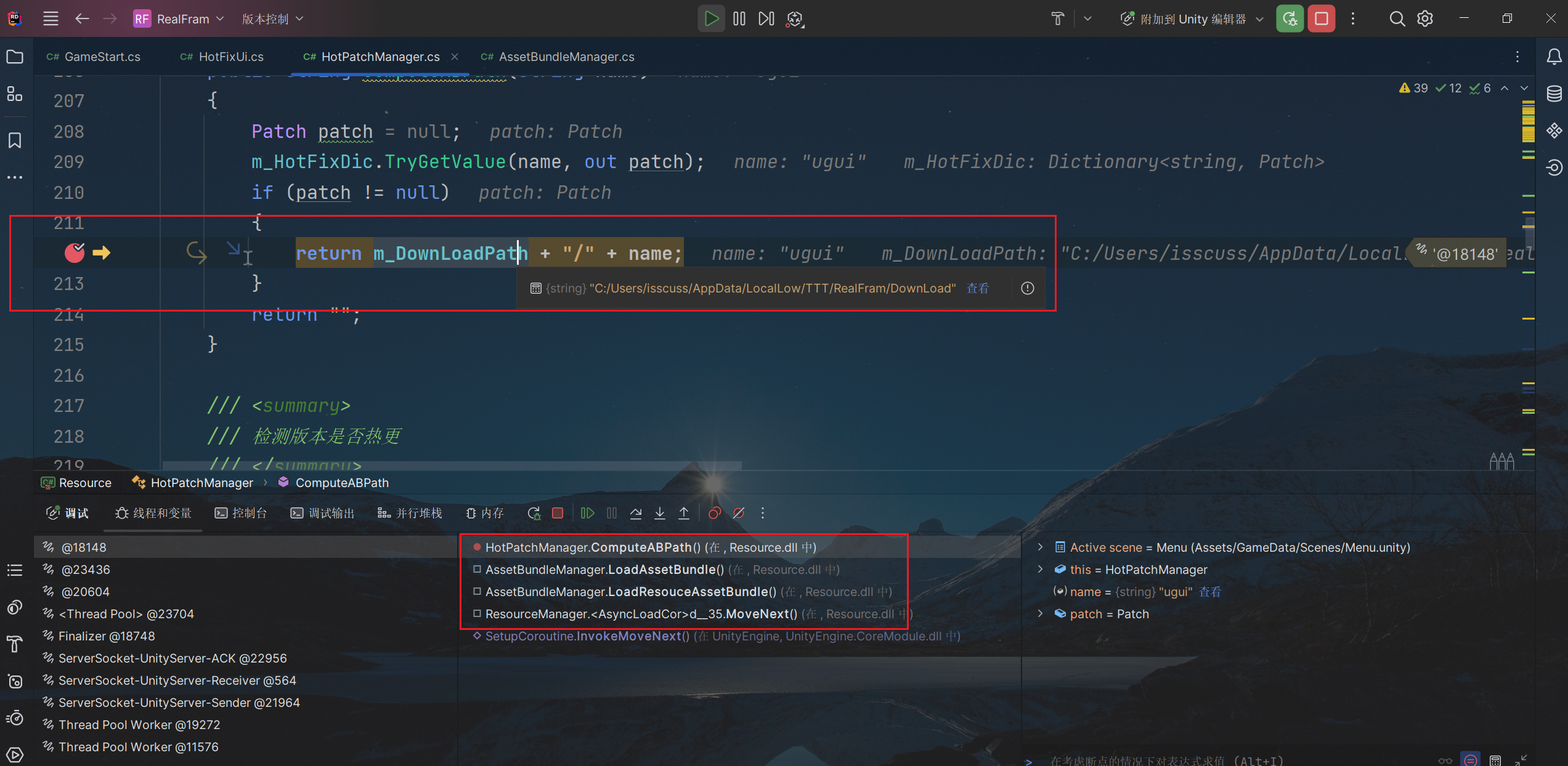 打断点,重新进入游戏,是通过AssetBundleManager管理器的LoadAssetBundle函数接口,完成ab包的替换、调用