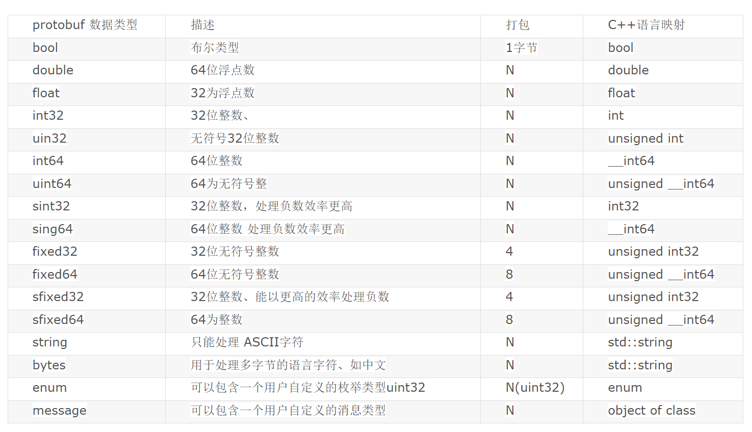 例如int32,如果数值比较小,在0~127时,使用一个字节打包。